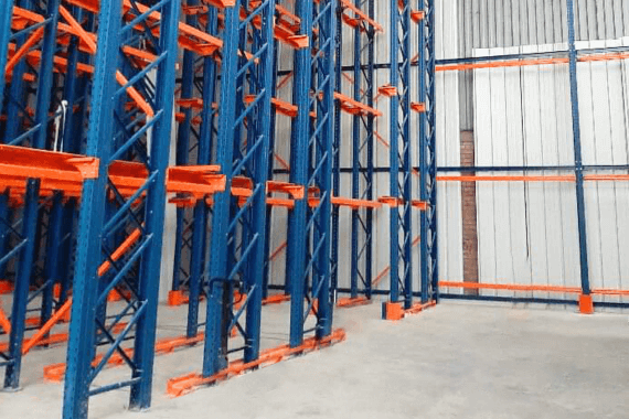 Sistema de almacenamiento que proporciona una mayor capacidad de almacenamiento de mercancías y máximo aprovechamiento de la superficie disponible. Sus elementos verticales se alinean longitudinalmente formando calles de carga en paralelo, estas calles se dotan de los componentes necesarios para el apoyo de los pallets, a ambos lados y en toda la altura de la estructura de forma que los montacargas accedan a estas calles para colocar o extraer las mercancías. Este sistema de almacenamiento acumulativo puede duplicar la capacidad de almacenaje al omitir un almacenamiento selectivo a cada pallet en beneficio de un mayor rendimiento del espacio útil. El dimensionamiento de la estructura dependerá del tipo y número de estanterías metálicas a emplear, índice de rotación de las mercancías, maquinaria a ser utilizada, espacio total disponible y del sistema de gestión logística implementado.